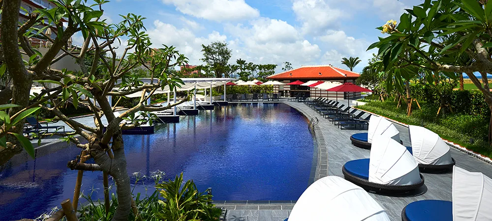 南国情緒あふれる洗練された風景と、ウォーターフォールのプール(350㎡)で優雅なプライベートタイムをお過ごしください。プールサイドバーでは冷たいドリンクやカクテル、軽食もお気軽に楽しめます。 営業期間:5月~10月。